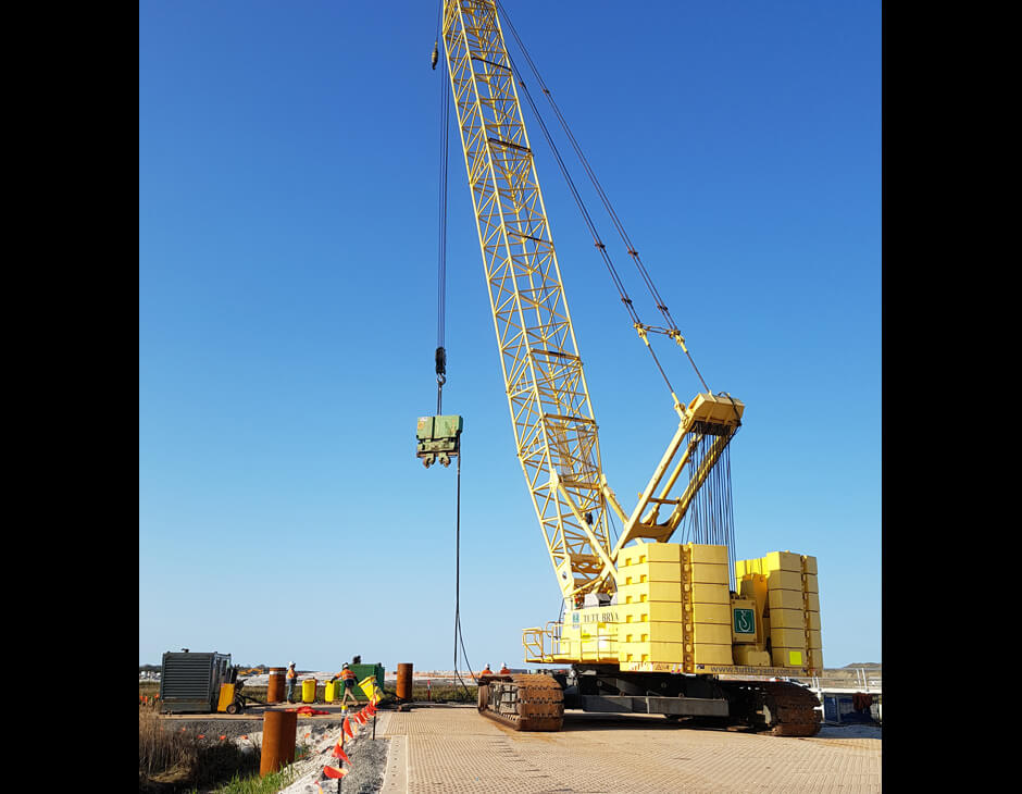 Dura-Base Composite Mats were selected to construct a piling platform for the crane. The mats' interlocking system created a continuous, load-bearing surface capable of supporting the significant weight of the 280-tonne crane and the dynamic forces of the vibro-hammer.