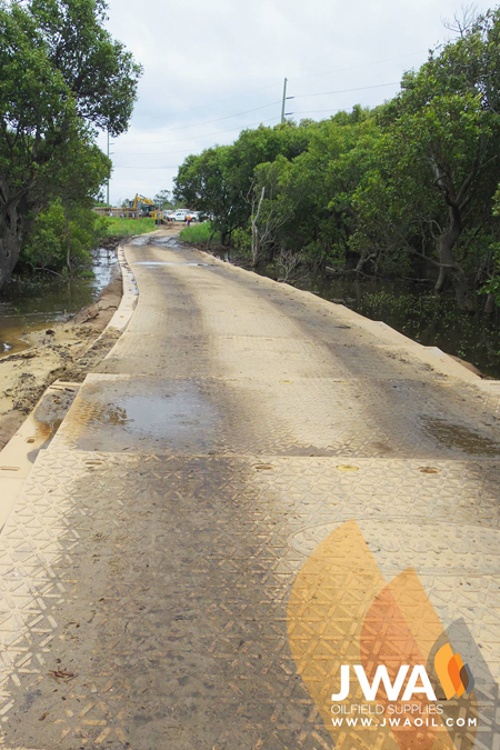 The modular panels proved to be the simplest solution with the least risk to the environment. Once interlocked together, the composite mats form a continuous stable surface for vehicles and equipment to travel on. This stops heavy vehicle tracks and tires from rutting the ground, leaving the buried acid sulfate soils undisturbed and inactive.