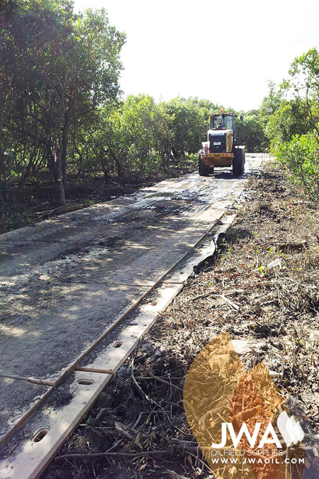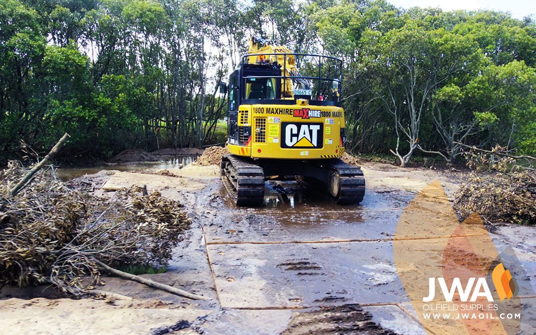 While the Dura-Base has a proven record for supporting heavy machinery in soft ground conditions, the team took the innovative approach of reusing cleared mangroves as mulch to level the ground, and provide an additional layer of padding under the mats.