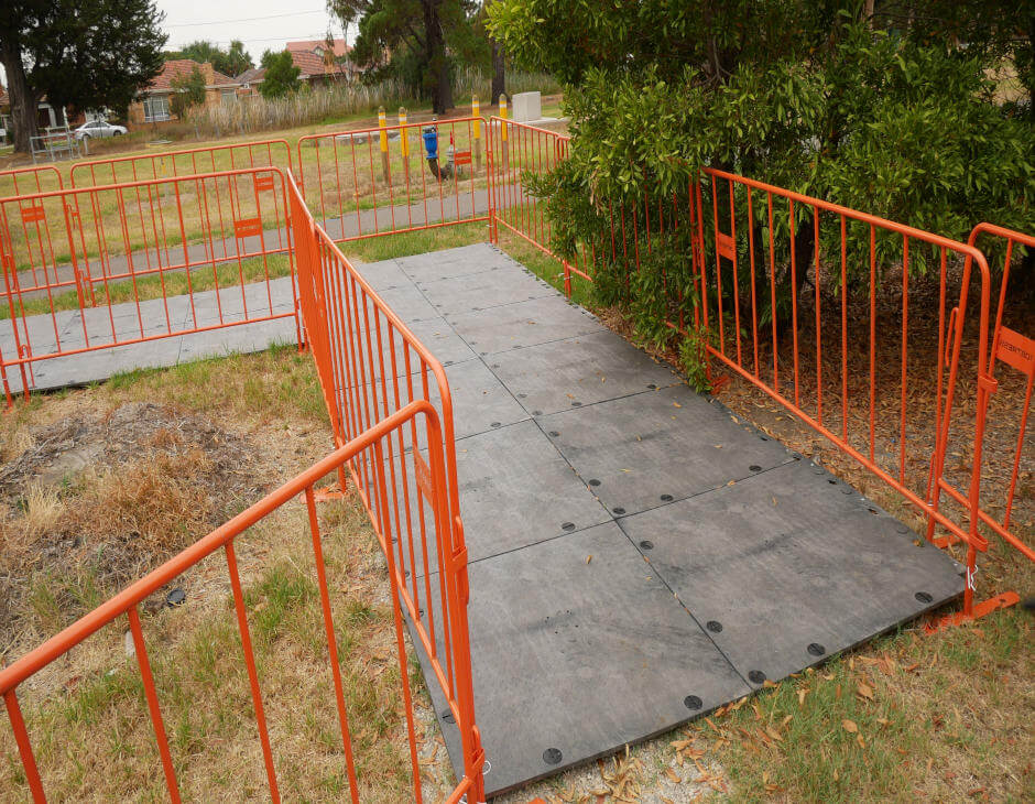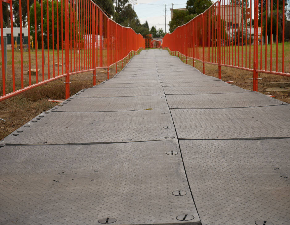 The construction team at the new Reservoir station in Melbourne required a clean and safe access solution for their site office, which housed over 50 staff. To prevent the office from becoming muddy and to protect the grounds from erosion, a temporary footpath was installed using man-portable, interlocking composite mats.
