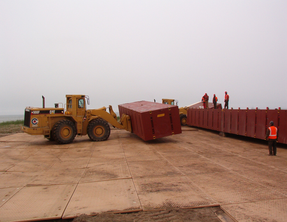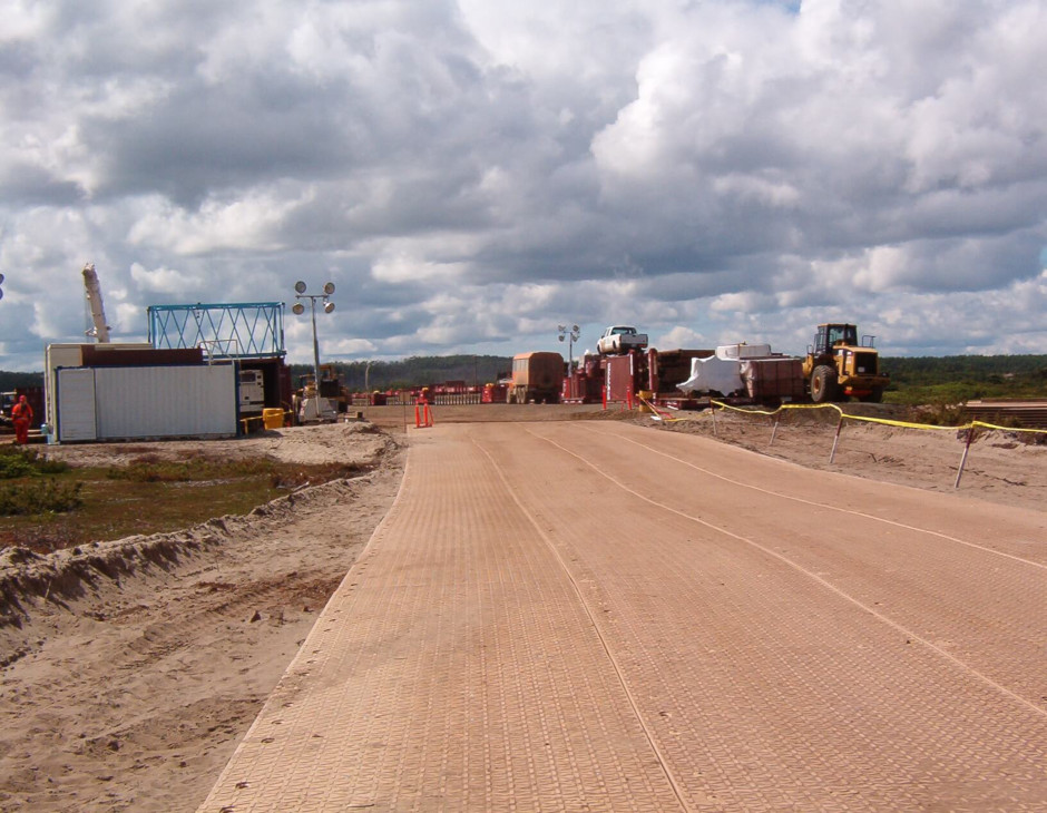 The Sakhalin-2 oil and gas development in Russia required a reliable and portable composite matting system to facilitate the construction of an LNG plant. Dura-Base mats were used to create heavy lift access pads for self-propelled modular transporters (SPMTs) to move massive modules across sandy terrain in extreme weather conditions.