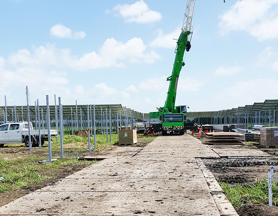 The Sunshine Coast Solar Farm project faced challenges with a low-lying, flood-prone site during the wet season. Dura-Base mats provided essential temporary access for 100t cranes, crane lift platforms, and mud-free staging areas, enabling the project to be delivered safely and on time.