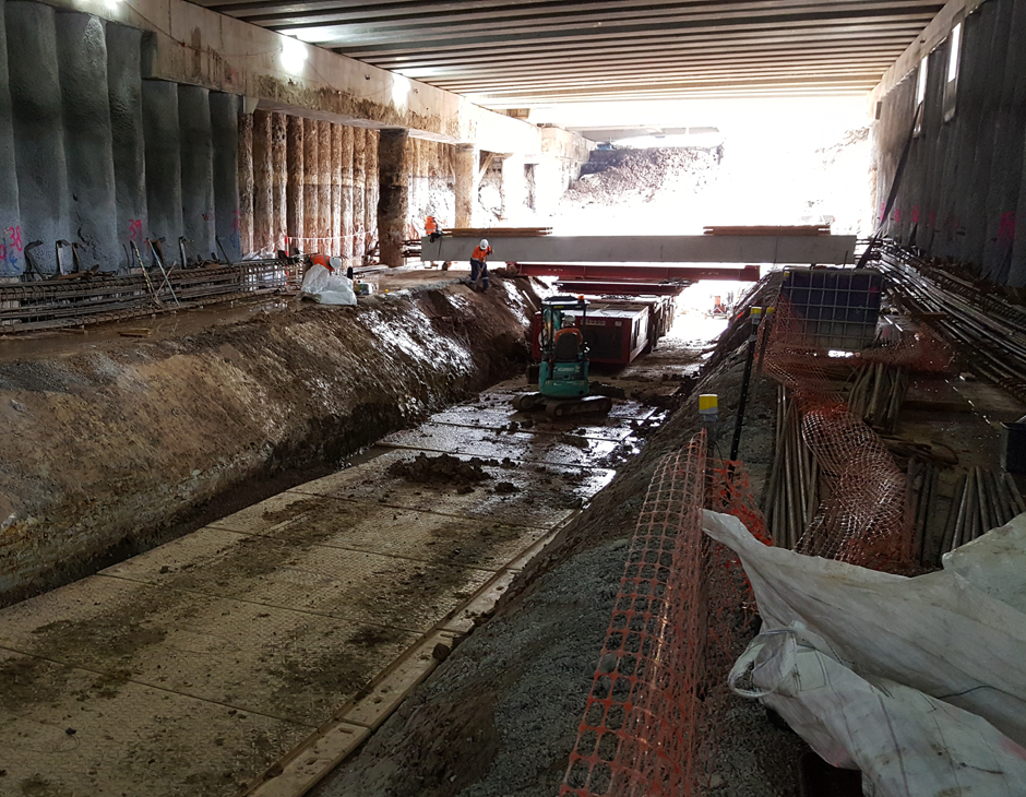 Large part of the project took place within a tunnel. Challenges include having stable working platform to install support beams for structural integrity of the tunnel. As the ground was found to have silica dust, the use of imported fill became untenable. The silica dust had the potential to contaminate the gravel and any time a vehicle drove over the ground, toxic substances would have been released into the air. Workers therefore had to monitor air quality and wear protective equipment the entire project.