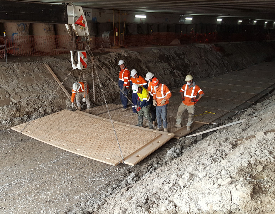 Once the installation was complete, the workers had to excavate another level down to install more beams. The mats were easily removed and reinstalled down afterwards. Preferable to imported fill as it would have increased the amount of truck movements and would require copious amount of time to retrieve.
