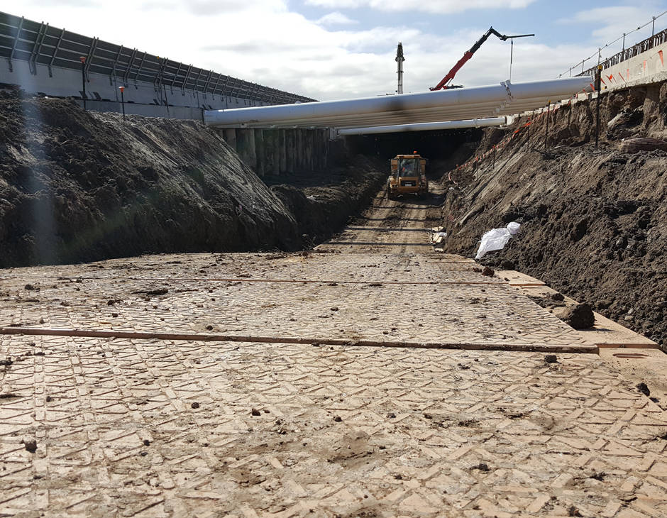 The thick 105mm interlocked mats served as a temporary access and used to stabilise the ground for for an SPMT to install horizontal beams. Uneven ground would have resulted in the machine unable to gain entry in the tunnel due to the unstable ground.